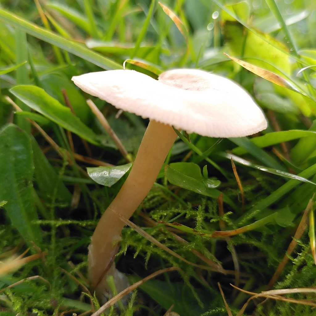 - 1.2–7 cm wide, convex to flattened, often developing a shallow central depression with age; the margin can be wavy, ruffled, or translucent-striate. The surface is smooth and slightly greasy to dry. It is hygrophanous, appearing pale yellowish-brown, tan, or pinkish-buff when moist and fading to whitish-cream when dry, often retaining a darker center.