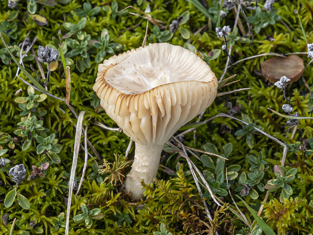 - White to cream-colored and decurrent, running down the stem. They are widely spaced, sometimes branched or veined with ridges, and have a soft, greasy texture.