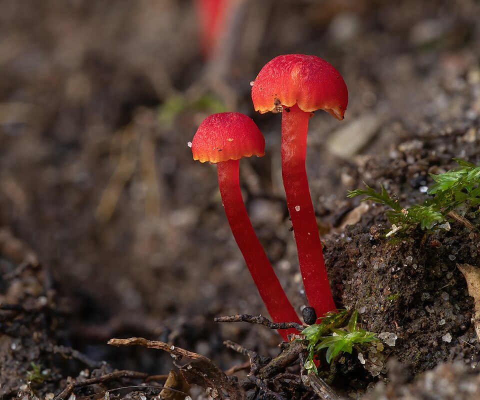 - 0.5–4 cm wide; initially hemispherical or convex, becoming flat or slightly depressed with age. The surface is dry to moist but never slimy, bright scarlet or orange-red, fading to yellow-orange. Often covered in fine, scurfy scales, especially near the center, and may have a wavy or scalloped margin that shows translucent striations.