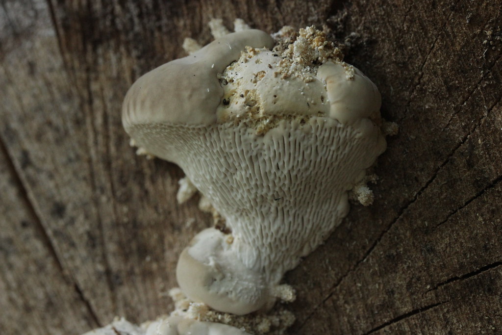 - Semicircular to fan-shaped, 5–20 cm across and 1–8 cm thick. The upper surface is flat to humped or bumpy, starting finely velvety then becoming smooth. Color ranges from grayish-white to pale gray or cream, often featuring concentric bands and frequently turning green due to algae growth.
